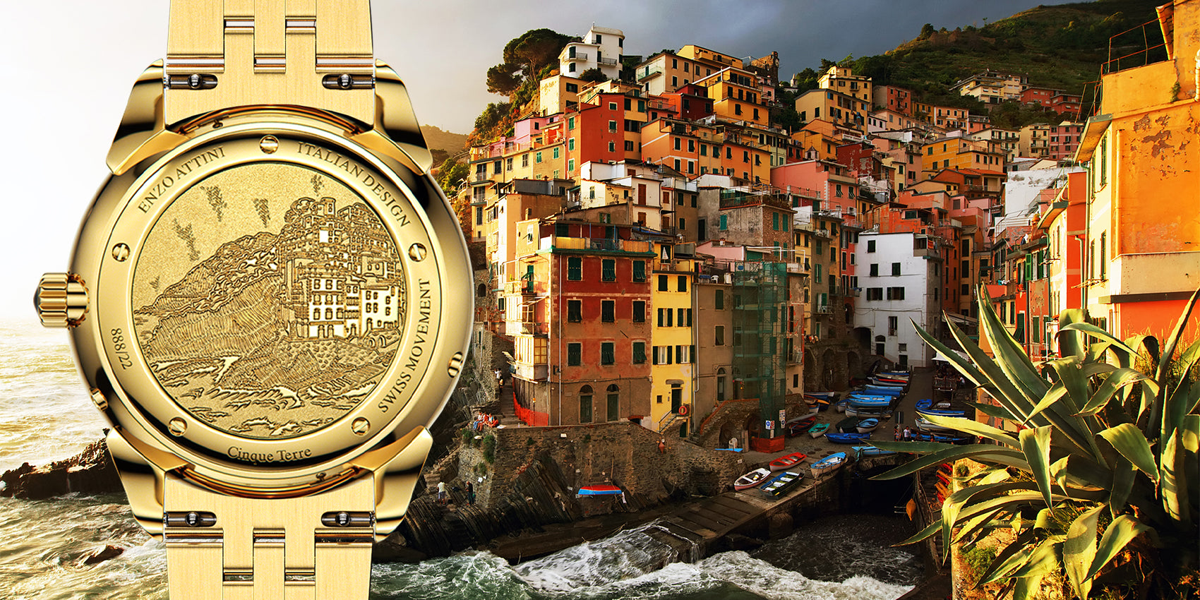 Me këtë orë, Enzo Attini përfaqëson traditën e mrekullueshme të dizajnit italian dhe trashëgimisë kulturore. Esenca e secilit dizajn dhe gdhendja e saj artizanale në kasën e pasme, janë të frymëzuara nga historia, arti dhe trashëgimia kulturore italiane, si dhe nga vendet mahnitëse që shërbejnë si destinacionet më të mrekullueshme në Itali.