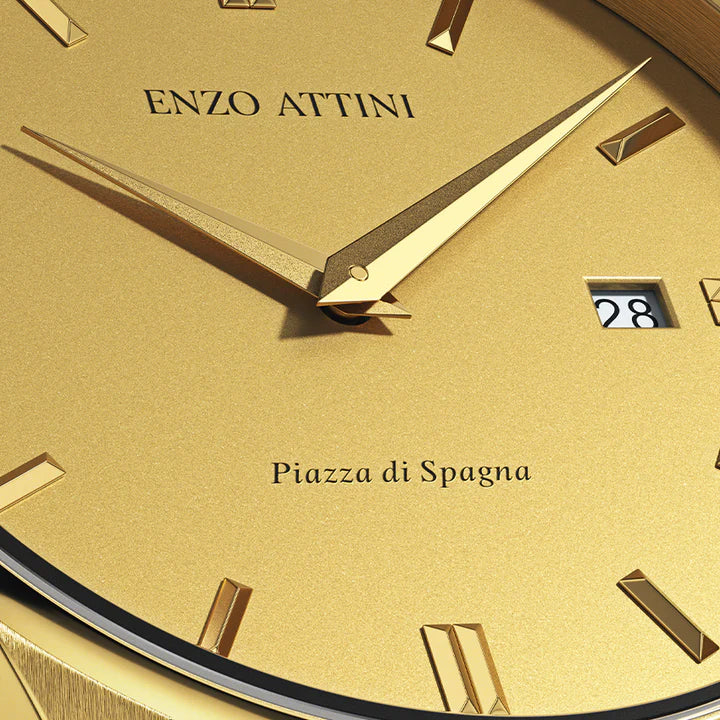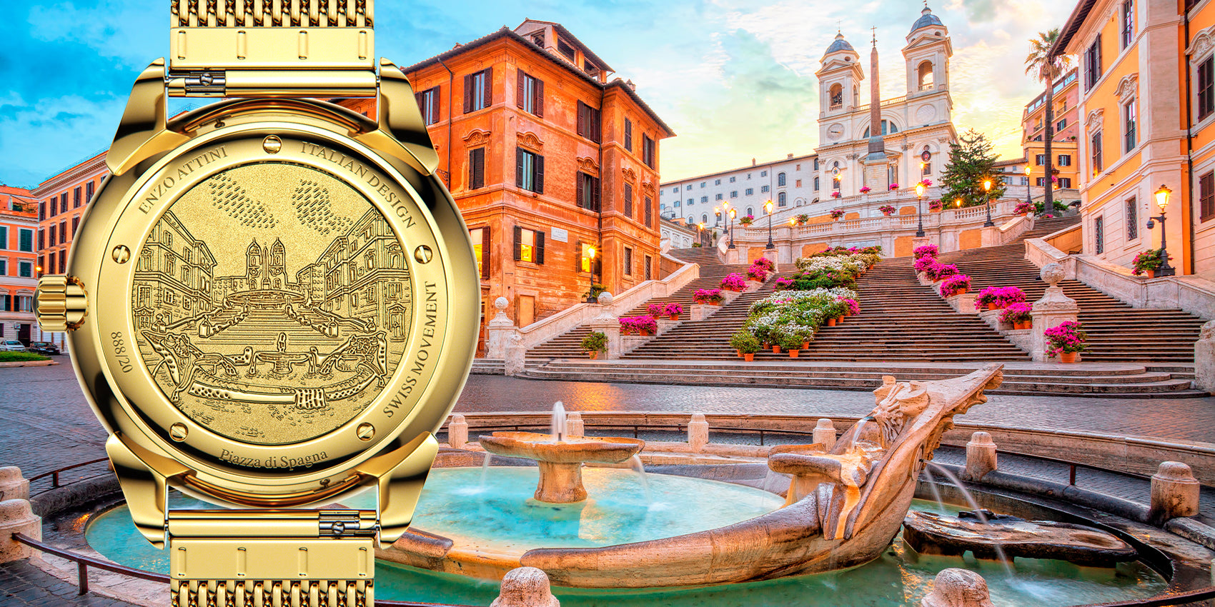 Me këtë orë, Enzo Attini përfaqëson traditën e mrekullueshme të dizajnit italian dhe trashëgimisë kulturore. Esenca e secilit dizajn dhe gdhendja e saj artizanale në kasën e pasme, janë të frymëzuara nga historia, arti dhe trashëgimia kulturore italiane, si dhe nga vendet mahnitëse që shërbejnë si destinacionet më të mrekullueshme në Itali.