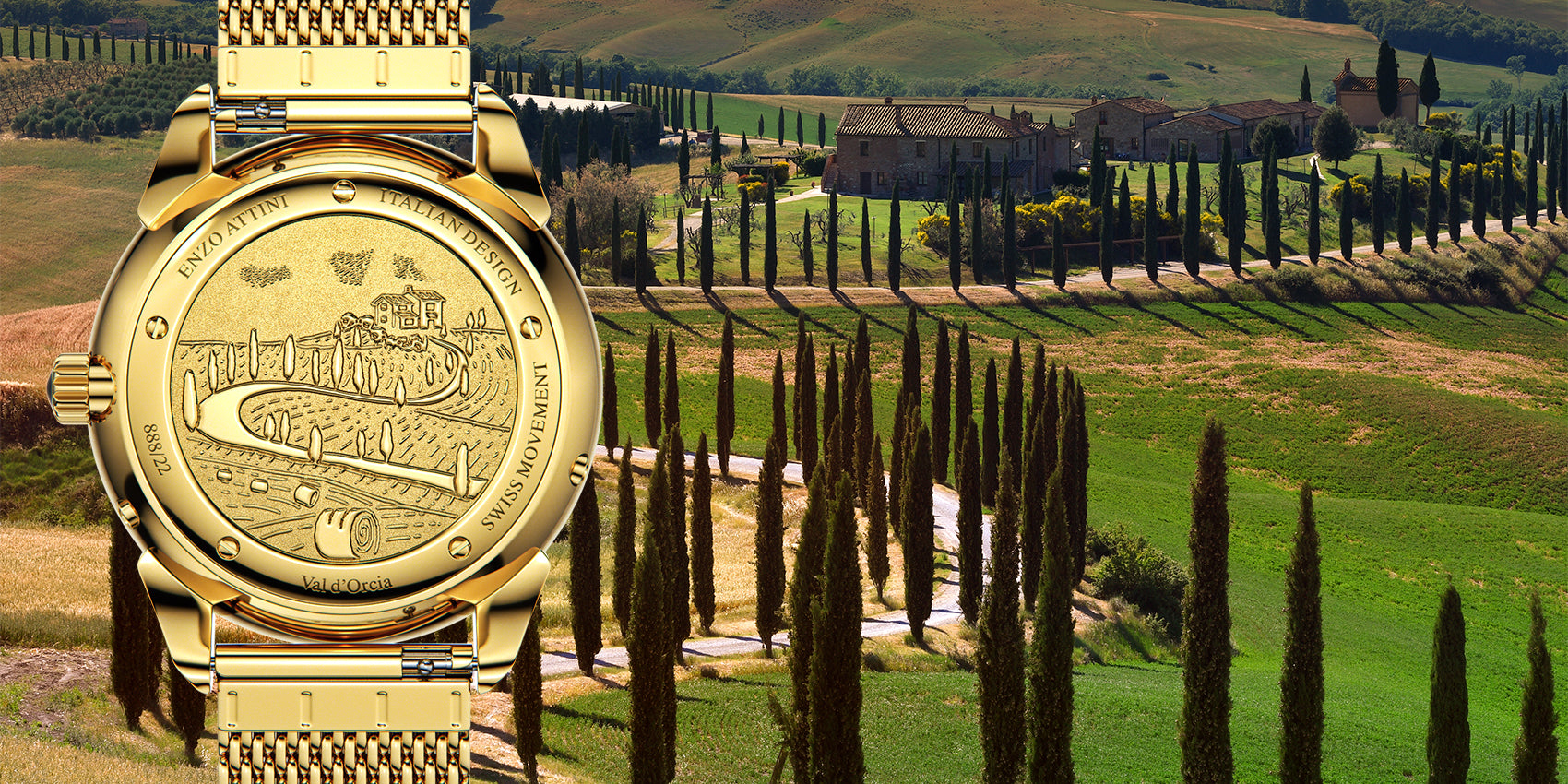 Me këtë orë, Enzo Attini përfaqëson traditën e mrekullueshme të dizajnit italian dhe trashëgimisë kulturore. Esenca e secilit dizajn dhe gdhendja e saj artizanale në kasën e pasme, janë të frymëzuara nga historia, arti dhe trashëgimia kulturore italiane, si dhe nga vendet mahnitëse që shërbejnë si destinacionet më të mrekullueshme në Itali.