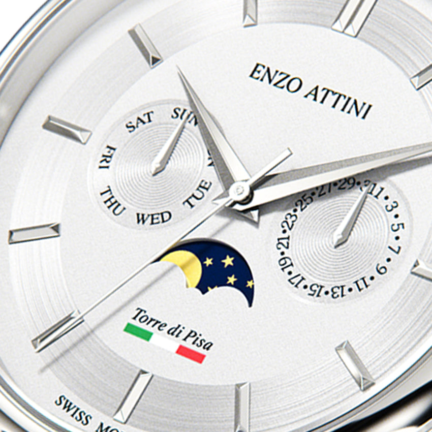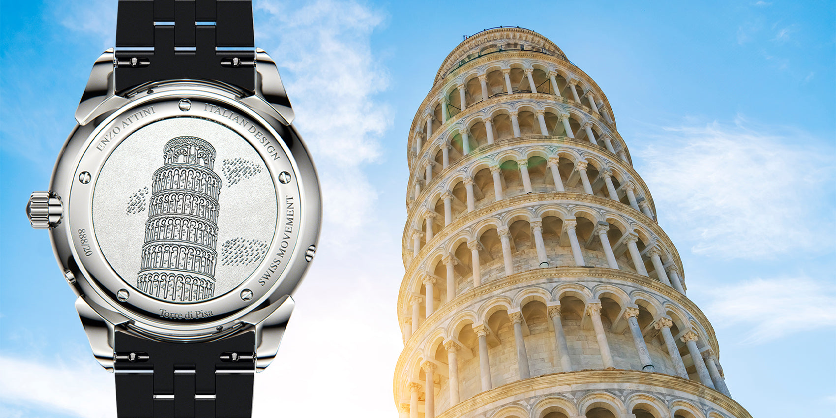 Me këtë orë, Enzo Attini përfaqëson traditën e mrekullueshme të dizajnit italian dhe trashëgimisë kulturore. Esenca e secilit dizajn dhe gdhendja e saj artizanale në kasën e pasme, janë të frymëzuara nga historia, arti dhe trashëgimia kulturore italiane, si dhe nga vendet mahnitëse që shërbejnë si destinacionet më të mrekullueshme në Itali.