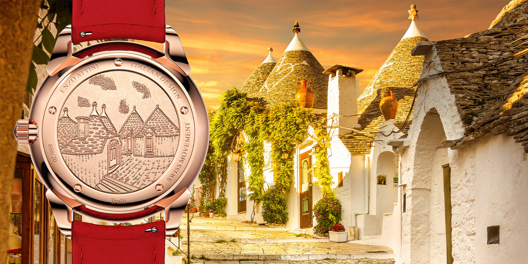 Me këtë orë, Enzo Attini përfaqëson traditën e mrekullueshme të dizajnit italian dhe trashëgimisë kulturore. Esenca e secilit dizajn dhe gdhendja e saj artizanale në kasën e pasme, janë të frymëzuara nga historia, arti dhe trashëgimia kulturore italiane, si dhe nga vendet mahnitëse që shërbejnë si destinacionet më të mrekullueshme në Itali.