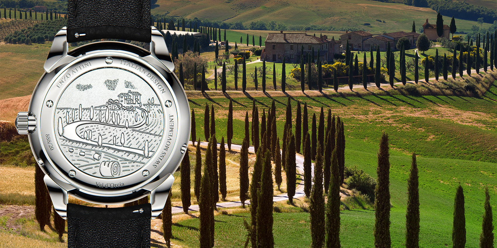 Me këtë orë, Enzo Attini përfaqëson traditën e mrekullueshme të dizajnit italian dhe trashëgimisë kulturore. Esenca e secilit dizajn dhe gdhendja e saj artizanale në kasën e pasme, janë të frymëzuara nga historia, arti dhe trashëgimia kulturore italiane, si dhe nga vendet mahnitëse që shërbejnë si destinacionet më të mrekullueshme në Itali.