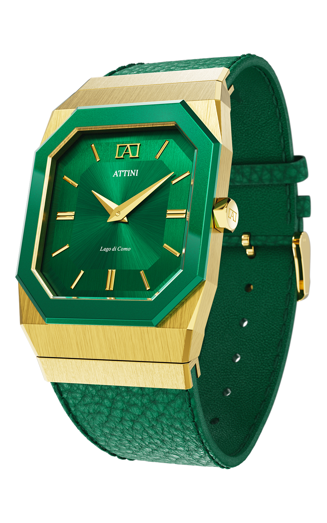 • Kasa: Stainless steel 316L, ngjyrë jeshile & ari (e larë me ar të vërtetë 18 karat), përmasat: 37mm x 7.9mm.