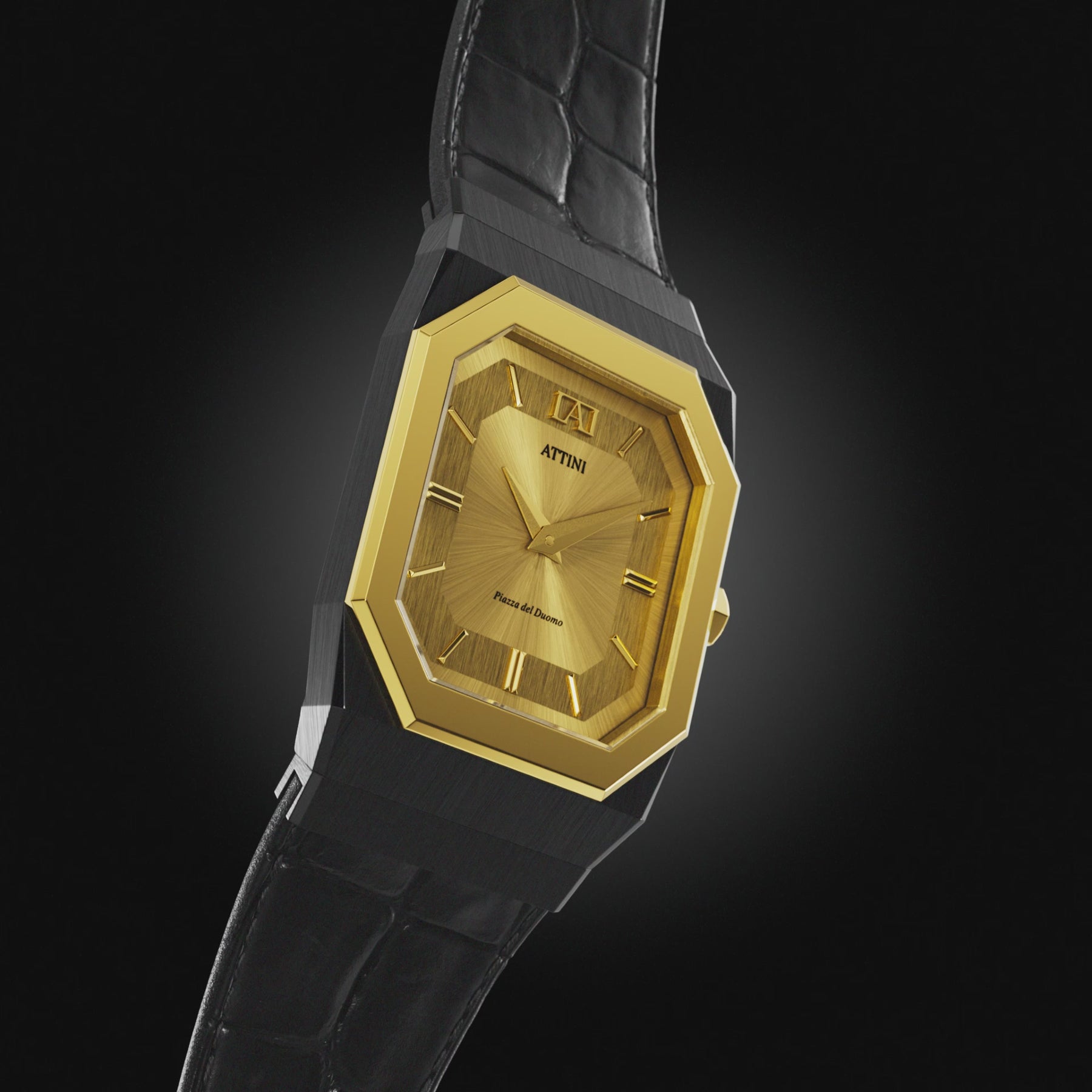 • Kasa: Stainless steel 316L, ngjyrë e zezë & ari (e larë me ar të vërtetë 18 karat), përmasat: 37mm x 7.9mm.