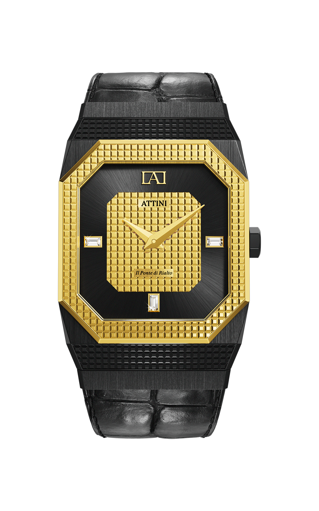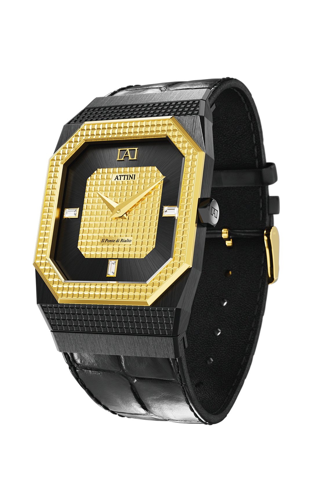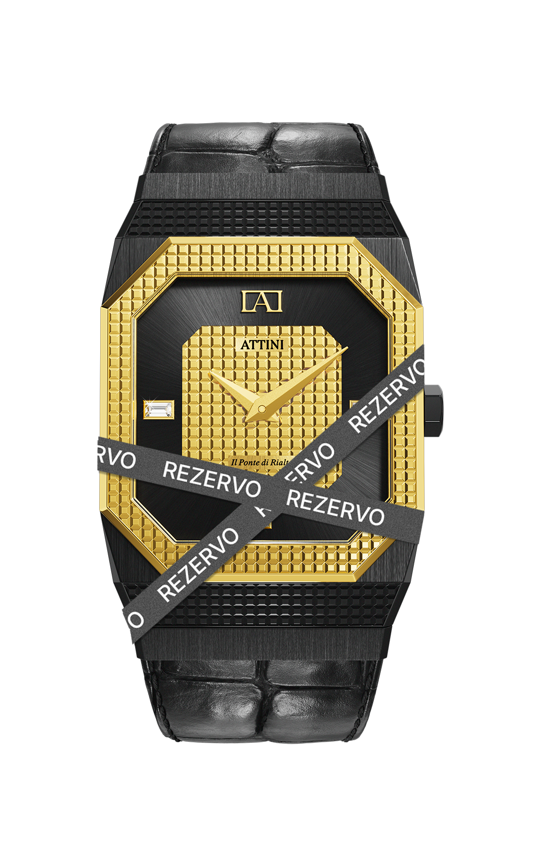 • Kasa: Stainless steel 316L, ngjyrë e zezë & ari (e larë me ar të vërtetë 18 karat), përmasat: 27mm x 7.9mm.