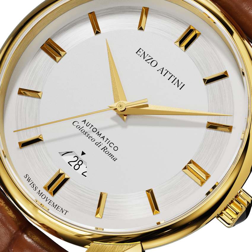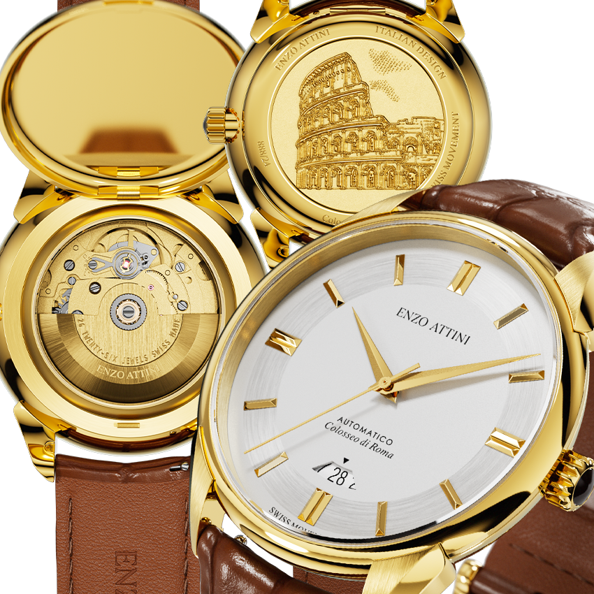 Enzo Attini ndërthur artin italian me mjeshtërinë zvicerane. Mekanizmi automatik me 38 orë rezervë energjie dhe 26 gurë të çmuar garanton elegancë dhe saktësi.