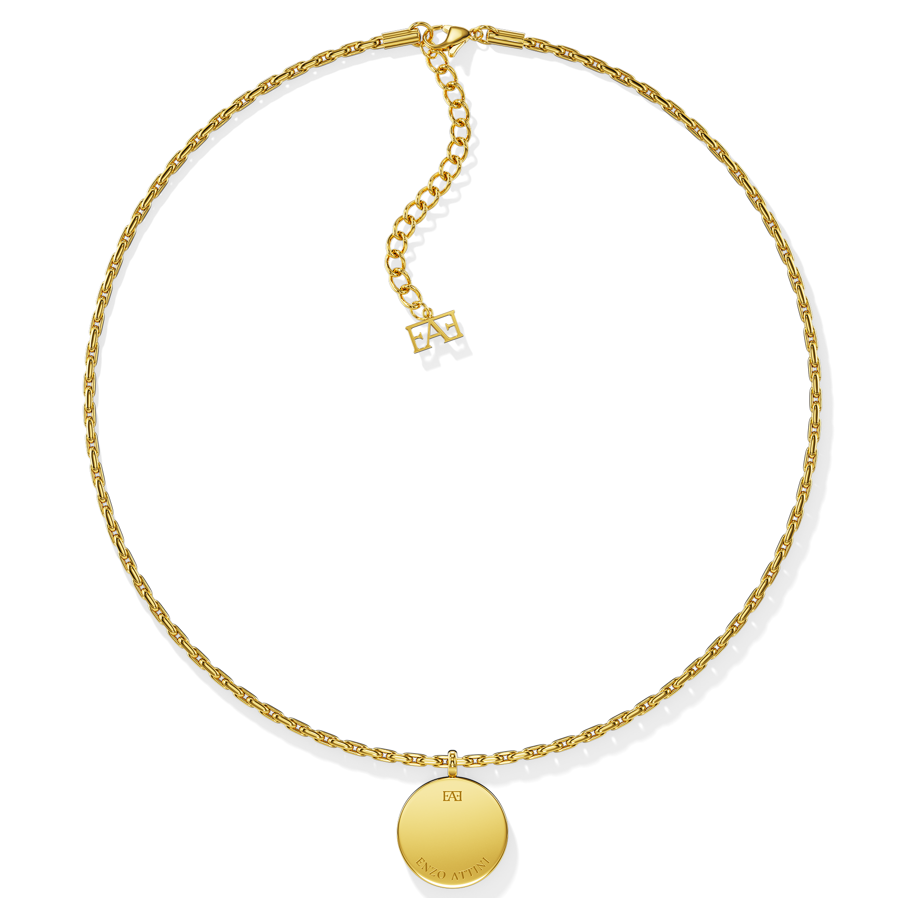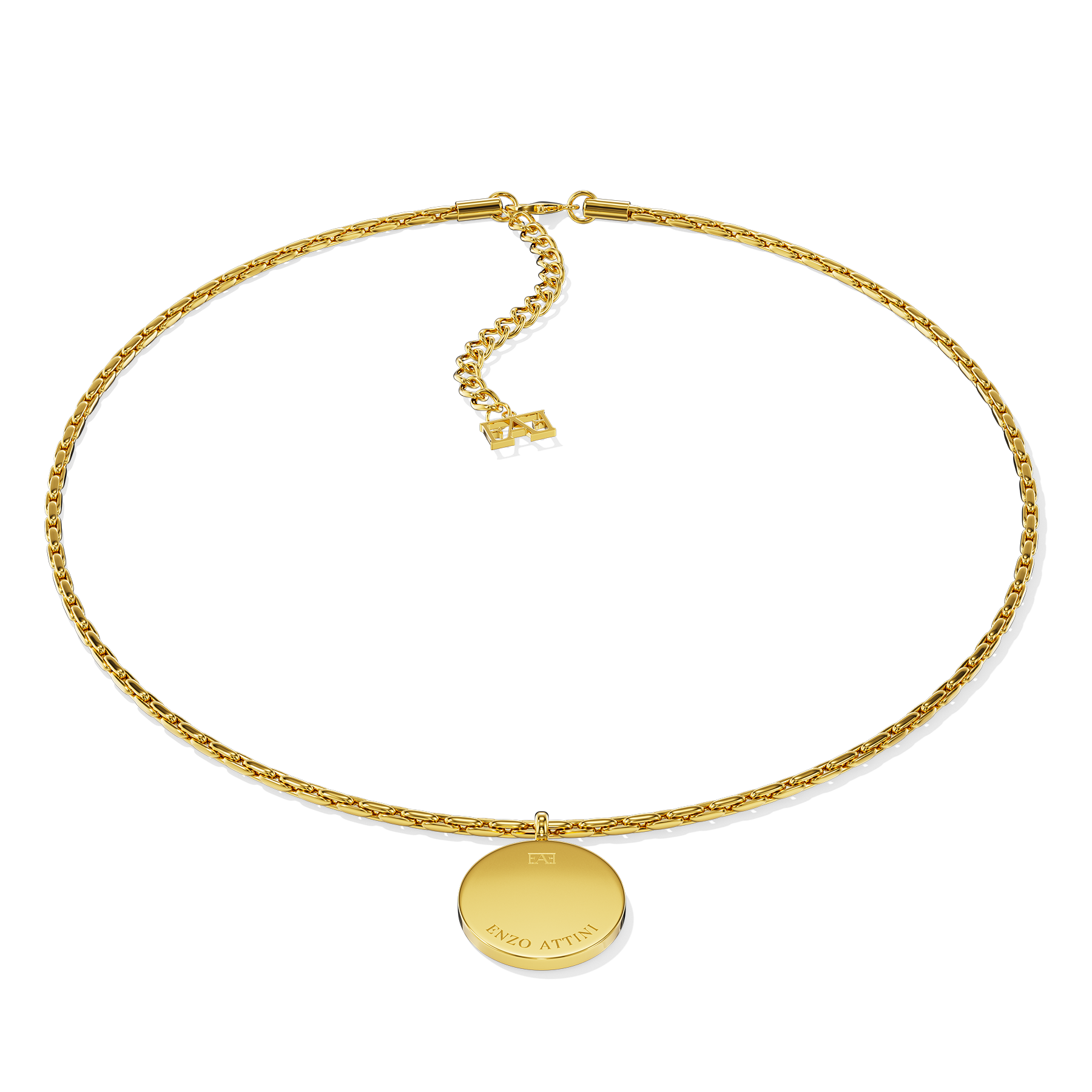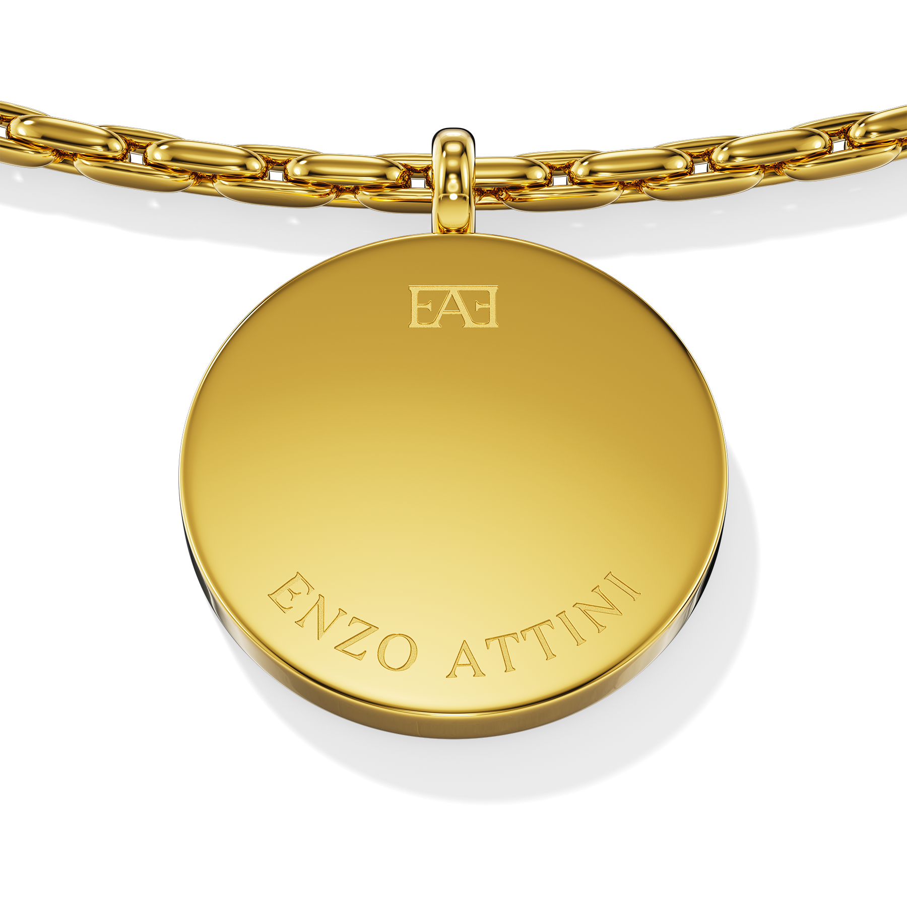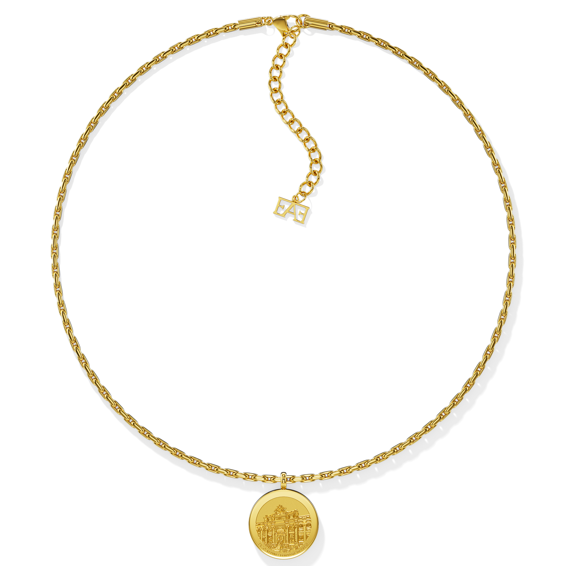 SPECIFIKAT • Materiali: Stainless steel 316L, ngjyrë ari (i larë me ar të vërtetë 18 karat). • Dizajni: Varësja vjen me medajlonin "Fontana di Trevi" te gdhendur në mënyrë artizanale. • Gjatësia: Zinxhiri vjen në 2 gjatësi dhe ju mund të zgjidhni gjatësinë e preferuar 1.Gjatësi maksimale 50cm 2.Gjatësi maksimale70cm • Diametri i medajlonit: 23mm • Paketimi: Vjen në paketim premium, ideal edhe për dhuratë. • Garancia: Varësja ka garanci ndërkombëtare 1-vjeçare.