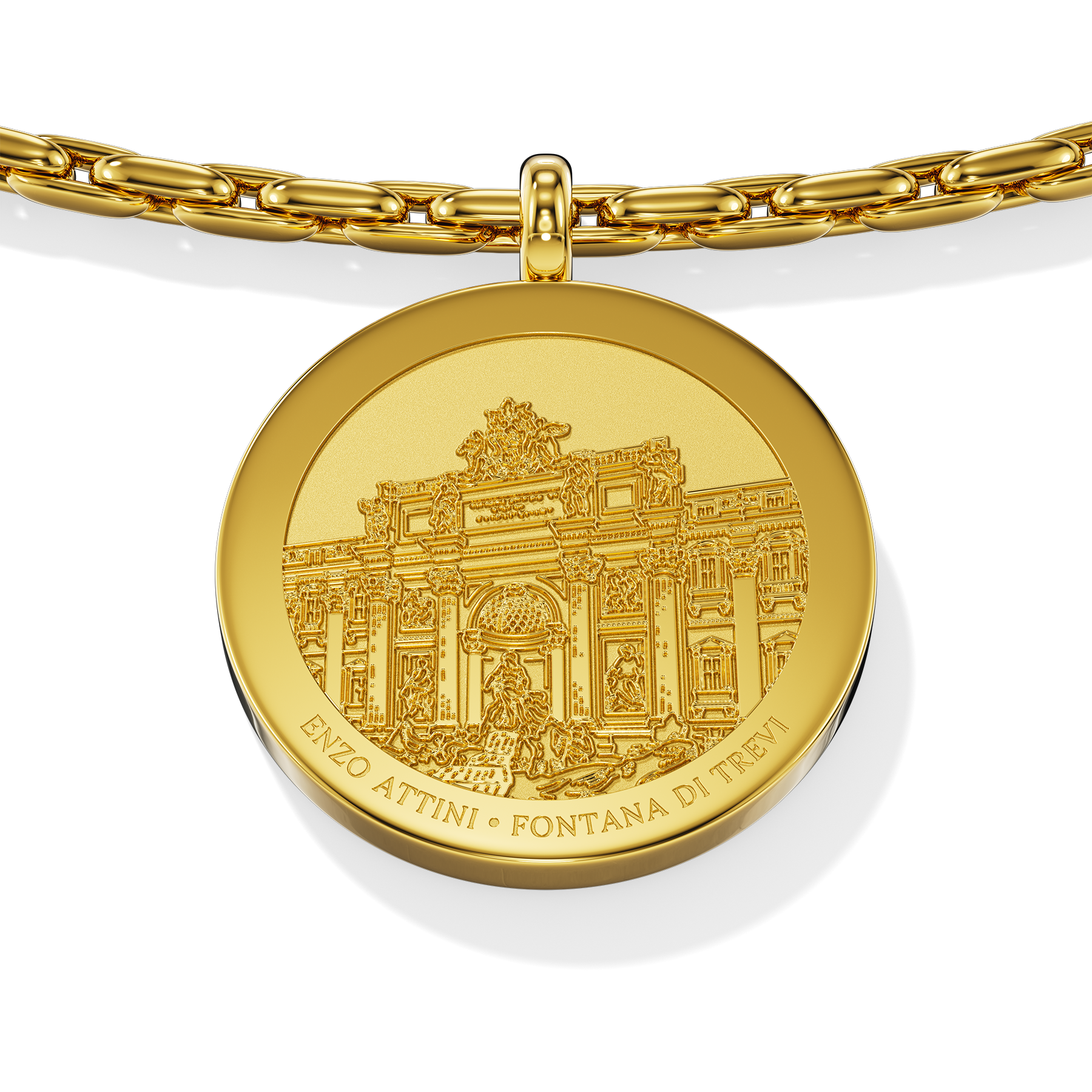 Dizajn ekskluziv: Medaljoni paraqet një gdhendje të detajuar të fasadës madhështore të Fontana di Trevi.